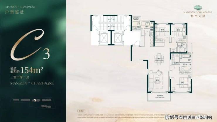 建面约154㎡3房2厅2卫户型▼