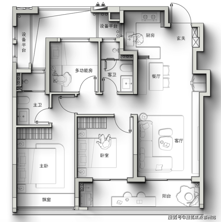 不仅做到了大边厅+四房,而且还带一个进深约2米的转角阳台(很多豪宅阳台进深也不过1.8米),就像自带一座空中花园。