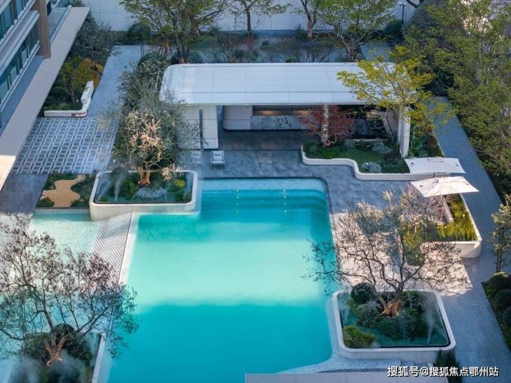 很多楼盘水池铺的都是瓷砖马赛克, 但它却用上了意大利卡拉卡白大理石,将池水衬出梦幻的蒂芙尼蓝 。池边摇曳着油橄榄树、造型紫薇,高级感丝毫不逊现在那几个网红豪宅。