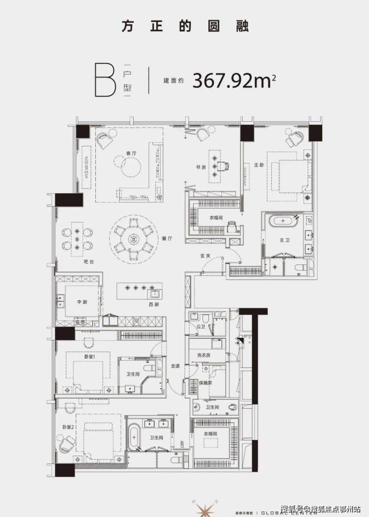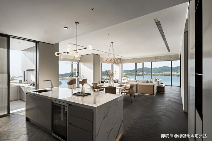 东方圆桌和大尺度西厨在客餐厅相遇,满足访客的不同需求;半开放的起居室可作为第二客厅,工作学习、休闲娱乐皆宜;三间卧室均为套房形态,家人生活互不打扰,主卧浴室里可见整面落地窗,浴缸摆放在窗前,让身心都融于自然。