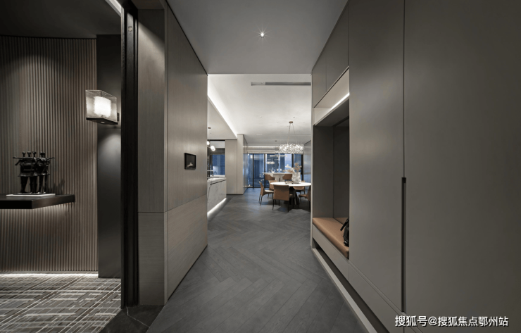 达美公馆,在首层及地下车库均打造了入户大堂,采取会所转化入户形式,路过会所,再归家。因与酒店同栋,建筑核心筒电梯间动线稍长,于是通过围合感屏风分段,让空间一分为二,并设等候区及艺术廊,添了一丝趣味。