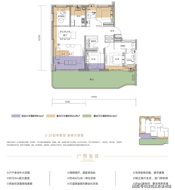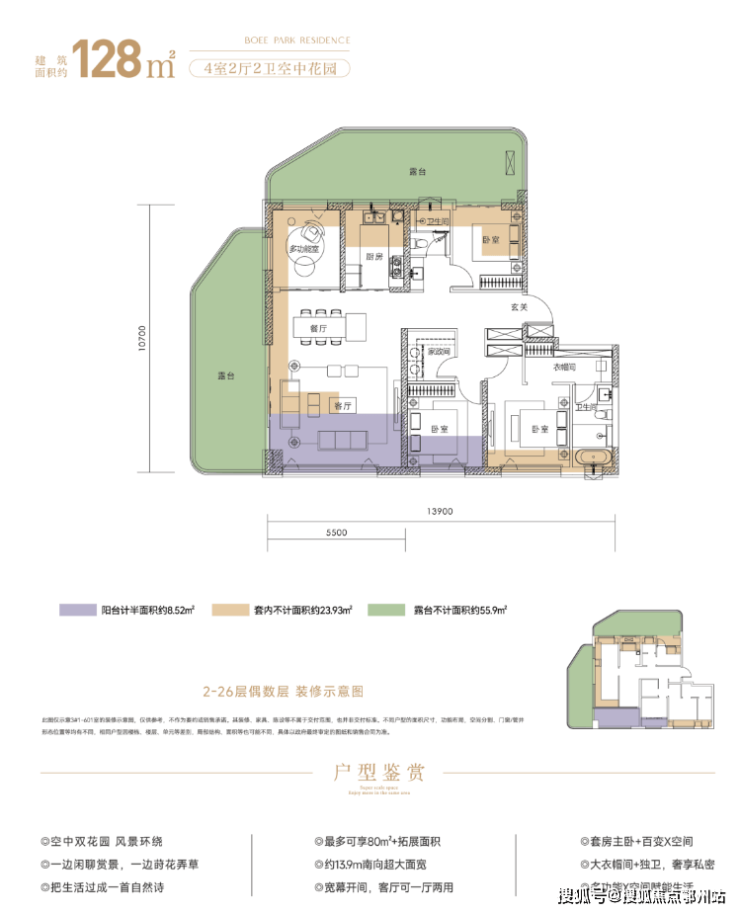 户户可享超大空中花园,解锁丰盛日常;建筑面积约128㎡最多可享约80㎡+拓展面积,南向约13.9m超大开间;建筑面积约113㎡可享约6.5m客厅开间,南向约60%优秀窗墙比。盛纳四时风景,更懂西安人的“院落”情怀。