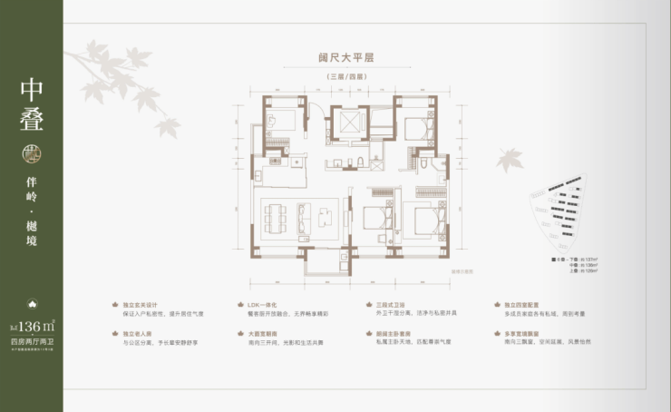 建面约137㎡下叠, 四房两厅三卫 全能格局,非常适合二娃家庭以及三代同堂。