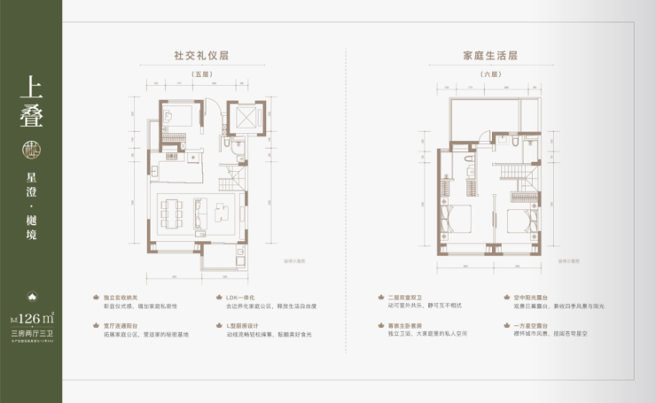 上叠产品都是带有空中花园露台,日常聚餐、烧烤、开party等娱乐活动有大展拳脚的空间,同时客餐厅一体化+U型厨房空间+尊崇主卧套房,户型设计合理,格局方正。