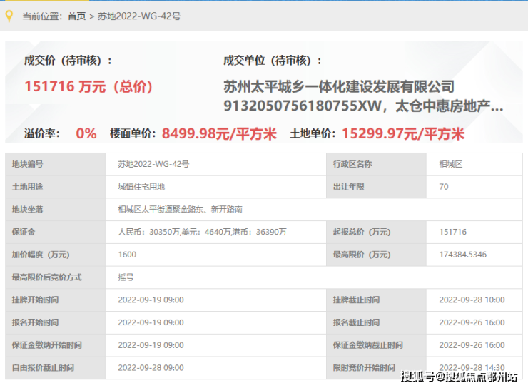 溪前雅居,即,苏地2022-WG-42号地块,位于相城区太平街道聚金路东、新开路南,是2022年9月28日,太平城乡一体化&中惠房地产以底价151716万元竞得,成交楼面价8500元/平。