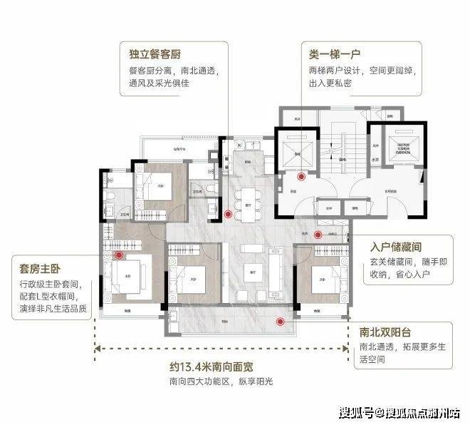 建面约 129㎡户型,四大核心优势:稀缺 类1T1户设计,私密入户体验;独立储藏间,收纳有序;约 13.4米南向大面宽,