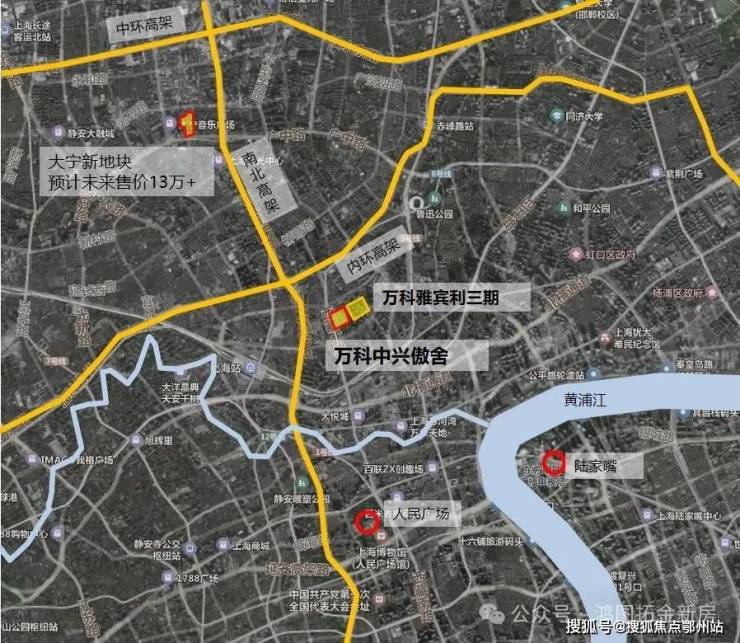 1. 傲踞内环,黄金区位 静安万科中兴傲舍位于中兴路板块南北复合发展轴与苏州河人文休闲带的交汇处,这一内环核心地段堪称城市的黄金心脏。
