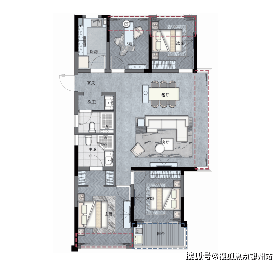 该户型 奢适四房设计,拥南向阳光双卧、北向次卧和书房, 一家三代同室而居,也能从容生活,尽享天伦之乐。