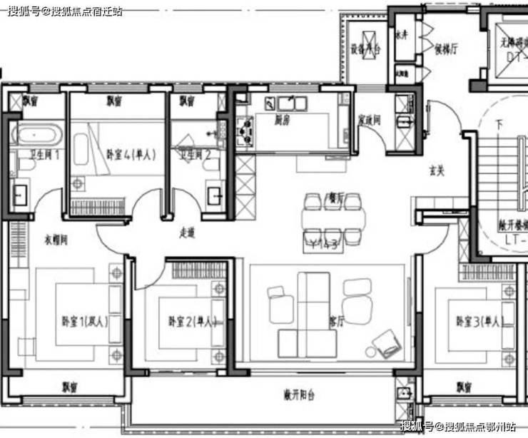 下叠建面约235㎡,4室2厅4卫,三套房设计。这个户型亮点,卧室做了全朝南设计!