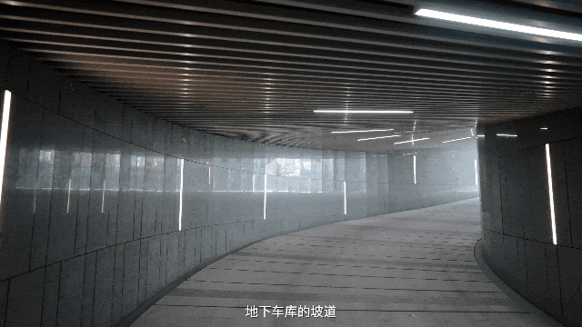 更惊喜的是,地下车库的坡道,摒弃了常规材料,采用 石材通铺,两侧是 进口的蓝眼睛石材干挂,顶部则是 白色铝板格栅装饰。