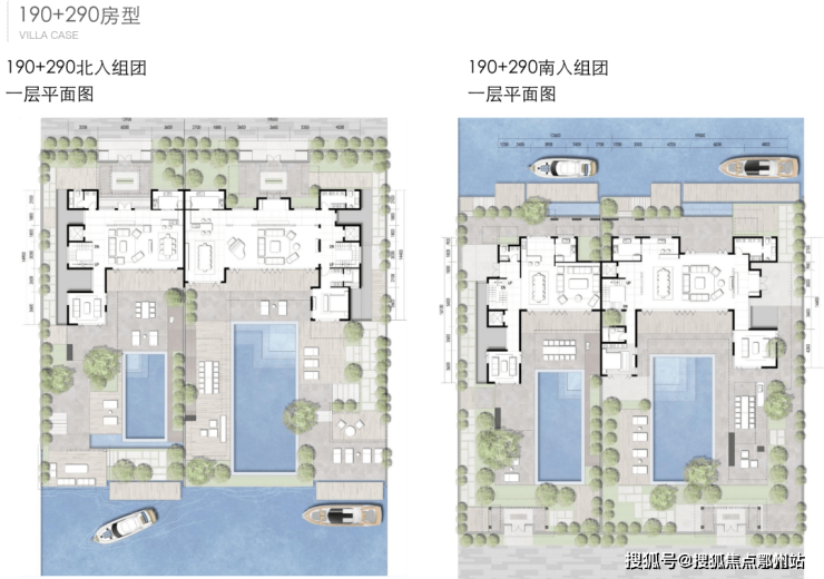 两种入户方式北入户的190+290房型,一层朝南直面庭院和泳池,