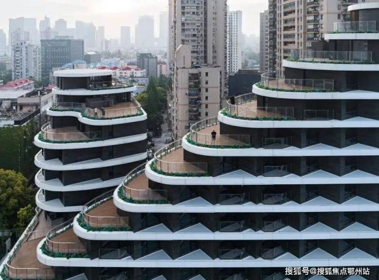 外立面采用玻璃幕墙现代简约风。建筑轮廓曲线蜿蜒,呈波浪线型层层迭高并后退,时尚感非常强。