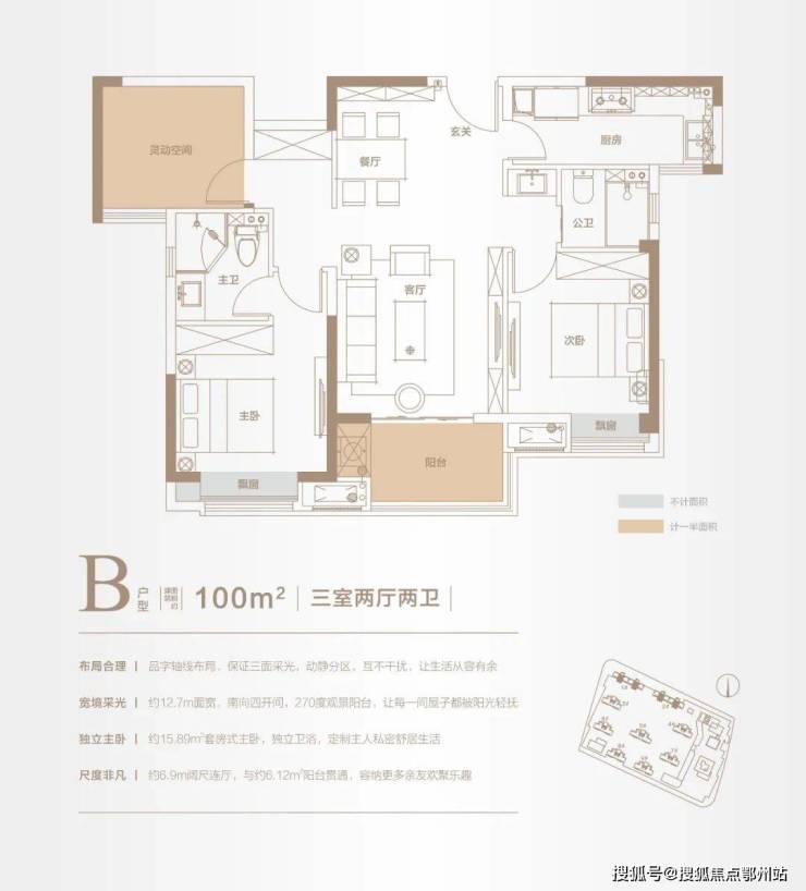 阳台+灵动空间+两个飘窗,让这个户型的得房率非常高,首次置业的刚需朋友选这个准没错。