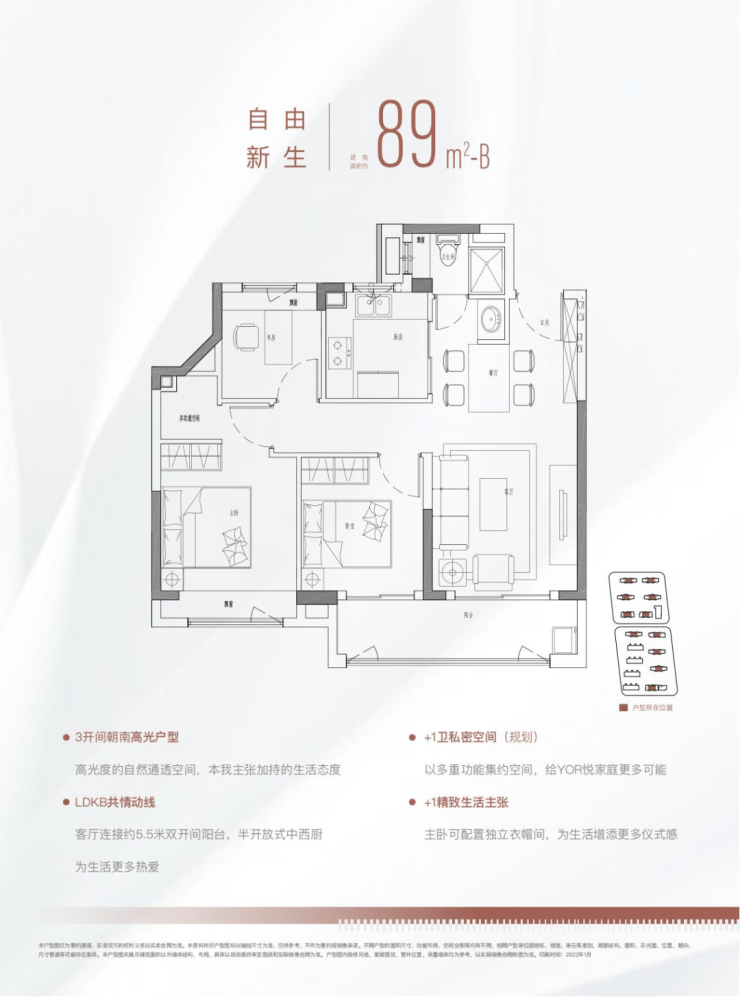 89㎡ 3房2厅2卫(规划)功能户型,入户洗手台规划设计,为业主在疫情常态化的新生活提供更健康的居家生活方式。