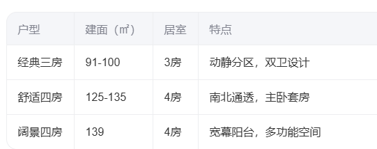 户型:主推建面约91-139㎡三至四房(具体含91㎡、102㎡、125-135㎡等),类一梯一户设计(户型在文末)。