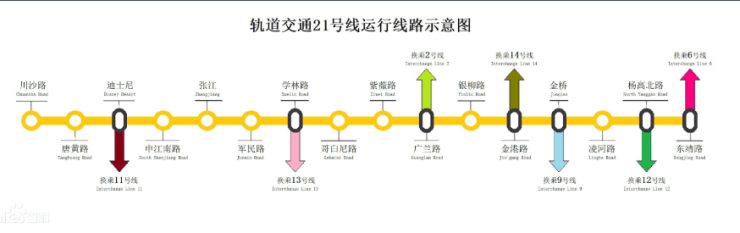 21号线申江南路站(直线距离约一公里,2022年已开工)在规划时主要参考原迪士尼线线位,串联起吴淞国际邮轮码头,吴淞客运中心、高桥、外高桥自贸区、金桥、张江、康桥、迪士尼、上海东站、浦东国际机场等板块,接轨多条地铁南北路线。(数据来源:百度百科)