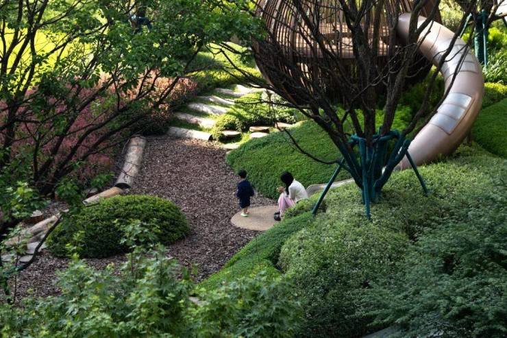 依托19米天然高差与315米超尺度中庭,天府九里构建了一座“立体公园社区”。景观不仅是对巴蜀山水风貌的当代转译,更通过多元场景激活、全龄功能植入及四季植物叙事,重新定义了公园城市的居住范式。