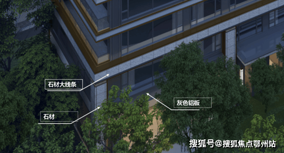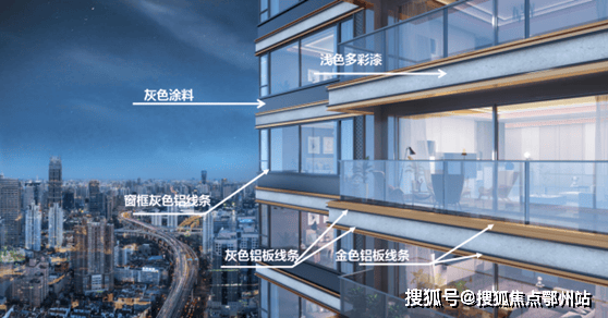 标准层外立面选材以涂料、多彩漆为主,层间以及窗框周边点缀铝板线条进行装饰;石材大线条以下的外立面(架空层和二层)均为石材和铝板(除窗户、阳台内侧墙面、玻璃栏板、百叶外)。