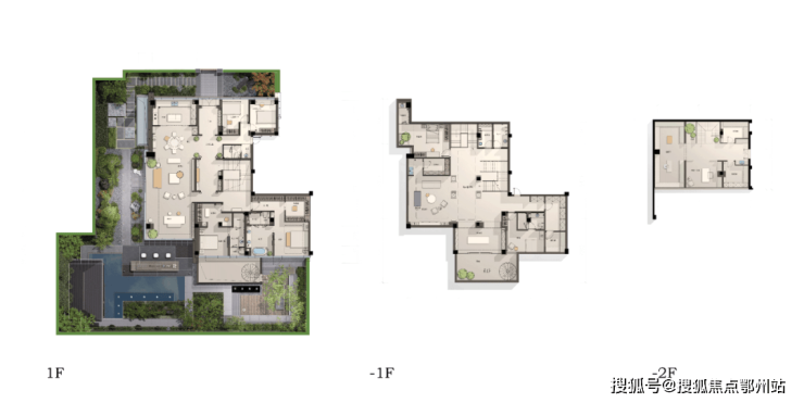 室内共4个户型各有特色,顶楼建筑面积约333㎡和建筑面积约357㎡的户型,约42m的面宽,相当于2/3个足球场的宽度,餐厅上方有天光倾泻而下,约250㎡的露台,像苏州园林般布局,主卧外还有个星空SPA池,躺在温暖的水流中,望着西湖群山听巴赫的《平均律》。