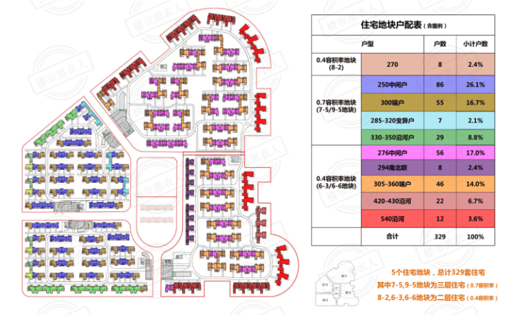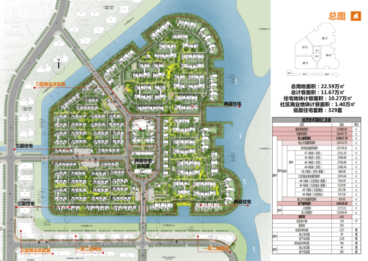 住宅地块:A7-5,A9-5地块为三层住宅(0.7容积率),A8-2,A6-3,A6-6地块为二层住宅(0.4容积率)。