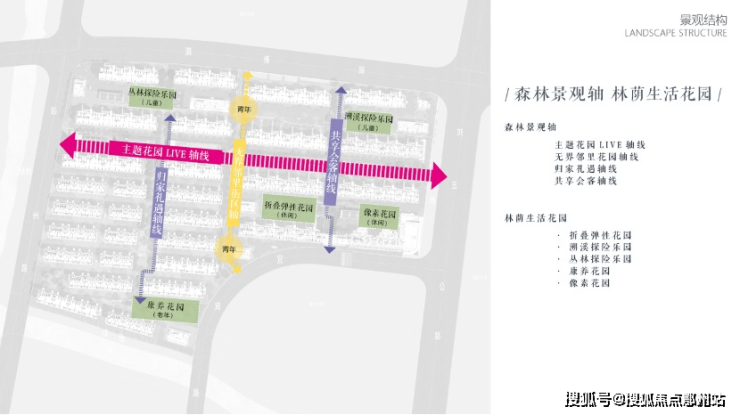 花语天境设计主体为 “自然森活+”由300M季相花园轴线+200M无界邻里花园轴线 构成大区特色的色叶林带主题景观。建筑风格现代简约,景观延续建筑的风格——打造都会繁华的自然森居生活体验。大区整体空间结构为 “四轴八园” ,我们将泗泾古镇的古朴气质与上海现代都会生活结合,在大区中描绘自然与生活的点滴画面。