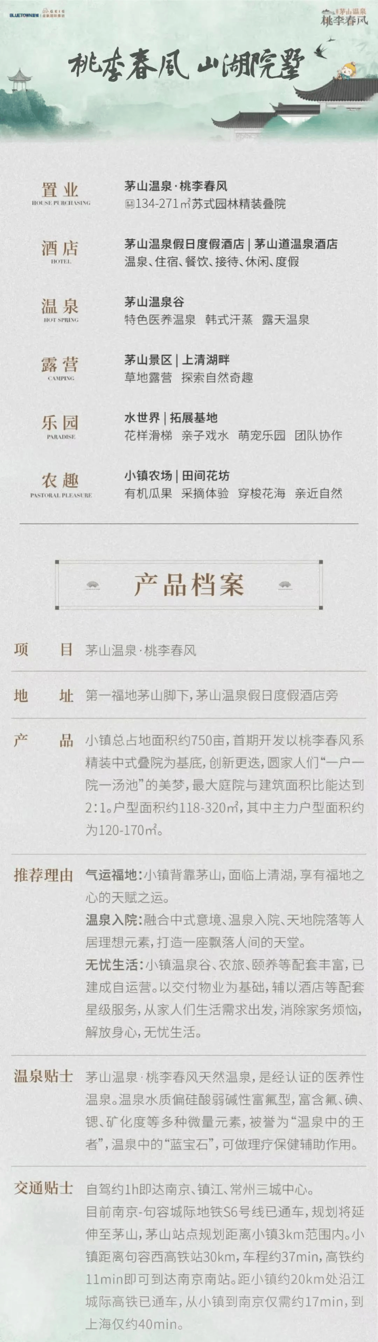 桃李春风背靠茅山风景区核心区,森林覆盖率超90%,负氧离子浓度达2.8万/cm³,上清湖碧波环绕,大茅峰巍然矗立,项目与华阳洞、喜客泉等景点形成“推窗见山、入院听泉”的生态界面,成为南京都市圈稀缺的“天然氧吧后花园”。