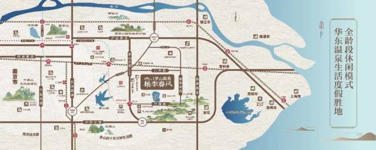 茅山温泉·桃李春风位于句容茅山大道88号, 距南京主城区约60公里,沪武高速、扬溧高速构成1小时交通圈。