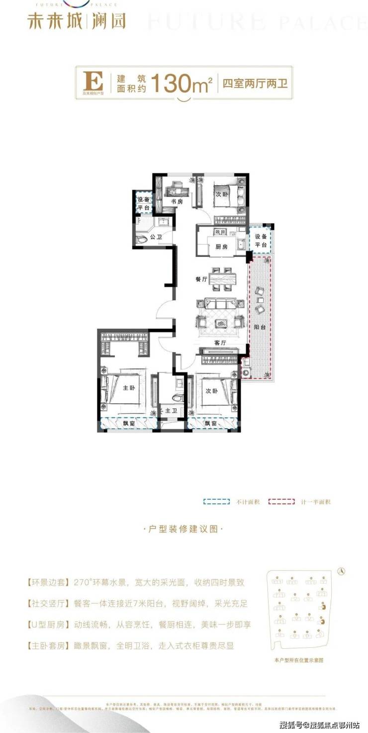 建面约130㎡,为5#楼东边套户型,东侧无楼座遮挡,且位于靠湖的位置 ,竖厅布局,餐客一体连接近7米阳台,直面自然风光,采光观景效果均佳,既是家庭欢聚空间,亦能待客会友,满足生活多种想象。