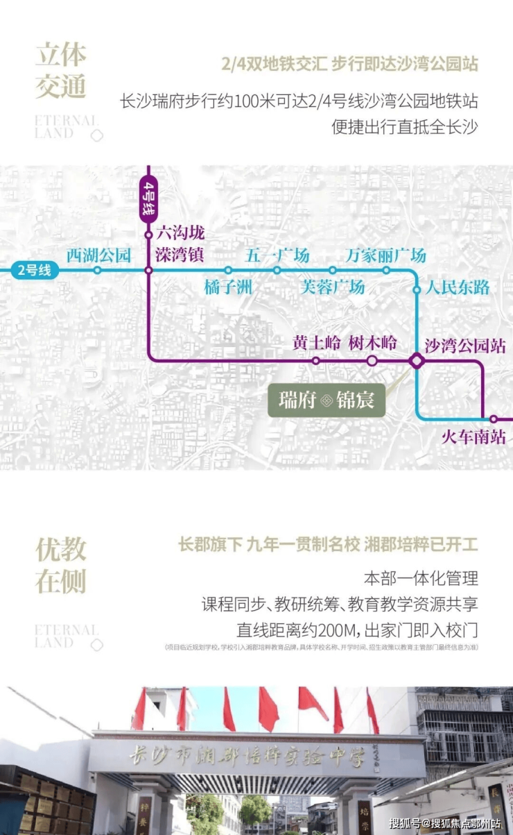 紧邻2、4号线换乘沙湾公园站,西侧约1km为4、5号线换乘圭塘站,向东最快2站可直达长沙南高铁站,“ 两横三纵 ”主干路网交织,快速串联城市核芯商圈、高铁站及机场,市内公交系统通达全城,城际交通可紧密联系株洲、湘潭。