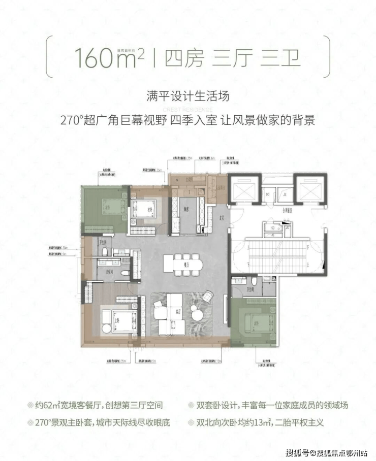 次卧开间均不低于3m,面积可达13㎡,拥有270°L型观景窗,最大化均衡每个房间,提升起居舒适度,北向双次卧,可灵动创变打造大套房,也可作为二胎平权房