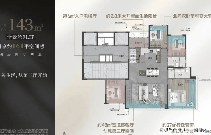 【建面约143㎡端厅户型图】建面约143㎡可享162㎡空间感