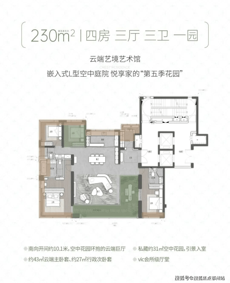 约45㎡行政主卧套,约10m,L型转角全明采光视野;
