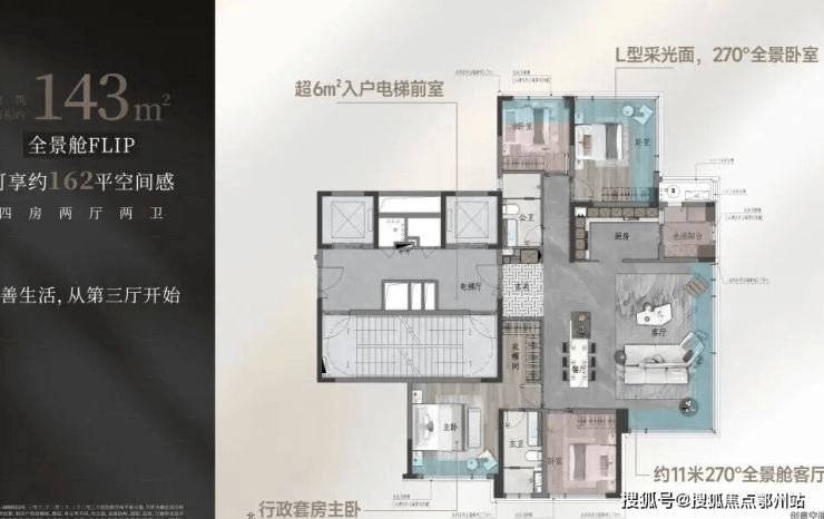 约4.5㎡独立玄关,约6㎡电梯前室,增加储物空间,提升归家仪式感