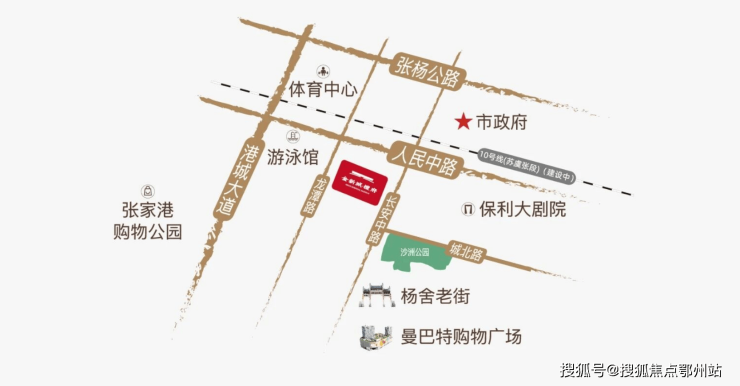 交通配套:位于张家港主城区核心地带,人民西路、长安中路、港城大道构筑多维网路,临近轨交 10 号线(在建)杨舍站,无缝接驳大苏州。