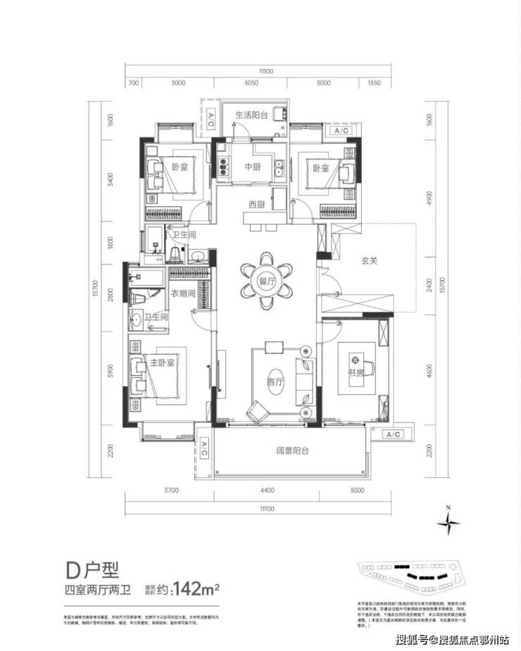 蓝光雍锦府共有四个户型;分别为建面约98㎡、110㎡的三房,以及建面约127㎡、142㎡的四房户型,全部都是 南北通透,带 南北双阳台,通风和采光效果非常好。