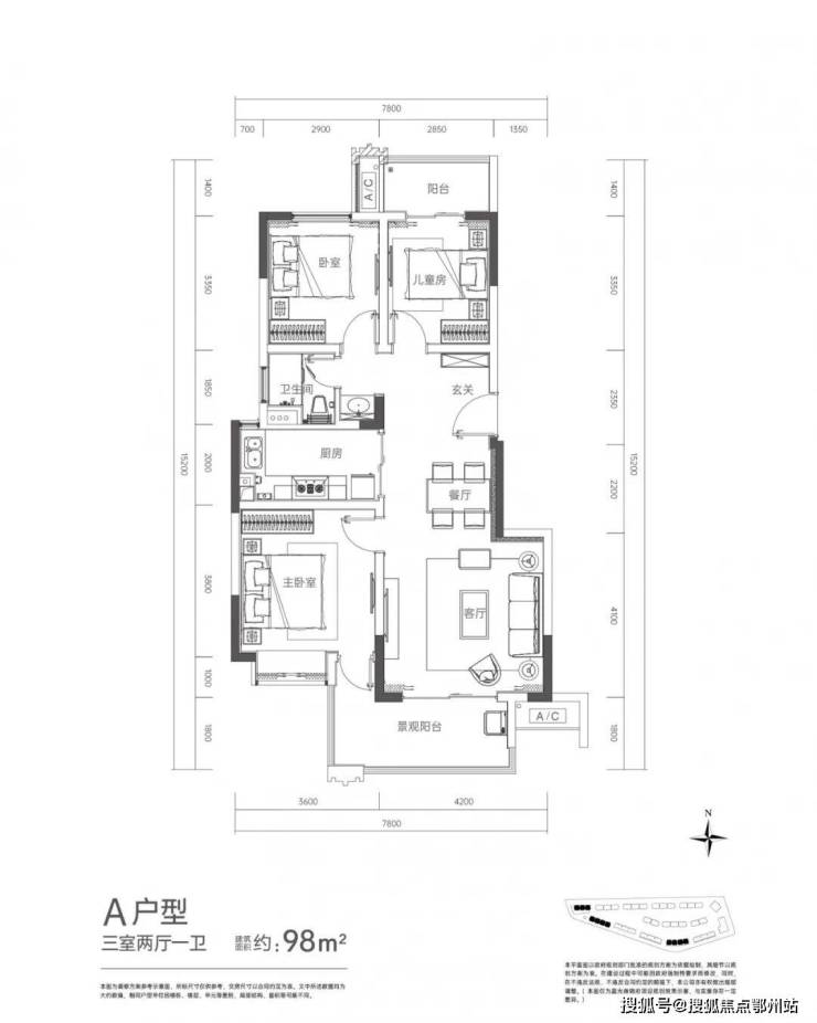 建面约98㎡户型,有约4.2米的开间客厅+南北双阳台,同时还能保证面积足够大(最小房间都在10㎡以上)。小编在长沙还没有看到哪个同面积的小三房,可以做到这么宽的客厅,双阳台以及大卧室的。