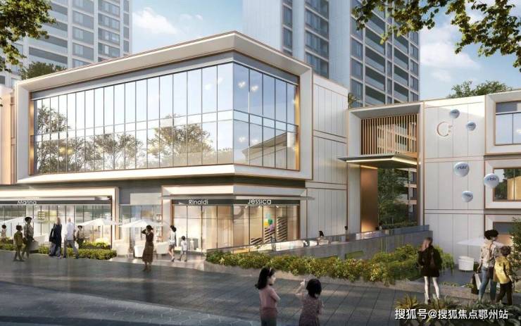 商业大面积玻璃幕墙立面,住宅与商业立面颜色协调统一