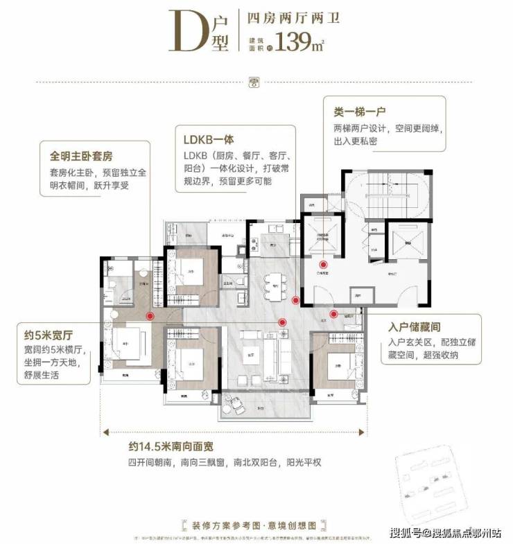 建面139㎡户型,客厅超5米的南向四面宽,大开间短进深设计,主卧带L型转角飘窗,独立全明衣帽间,尊贵感强。建面约160㎡户型南向超15m,四房三卫格局,L型步入衣帽间,更好的私密感。