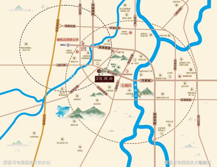一脉诸暨城市交通主轴——苎萝路,无缝接驳主城;经环城西路接轨诸暨高铁站、沪昆高速、诸永高速等多维交通路网,出行便捷。快速融杭时代,将实现“20分钟+”高铁圈,半小时高速圈。
