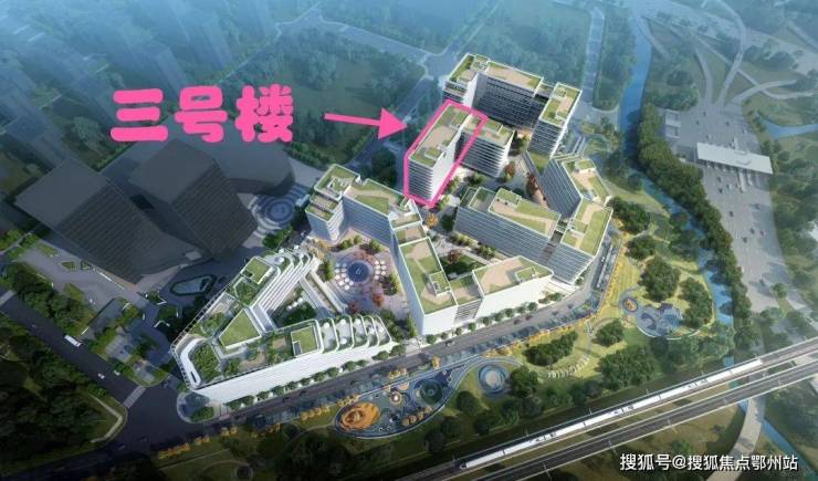 以上为良渚芯云项目整体效果图,粉色标记为三号楼位置,处于项目核心位置,正对双向四车道芯云路,前后畅通。