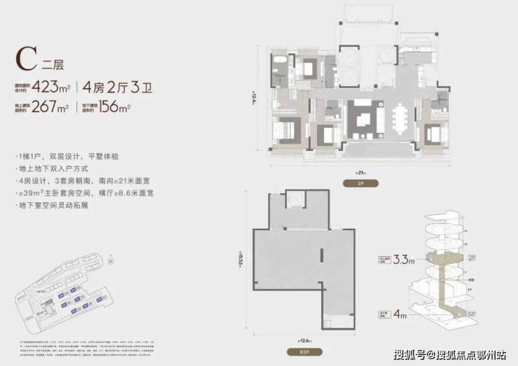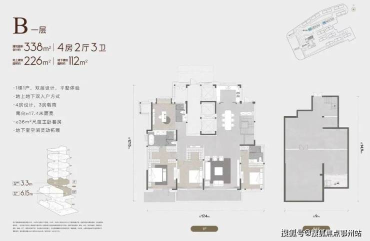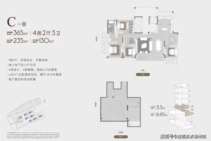 建筑面积合计约335-445m²,地上建筑面积约226-286m²,地下建筑面积约108-186m²,地上层高3.3m,地下层高4-6.65m,双入户方式,坐享买一层得两层的平墅生活。