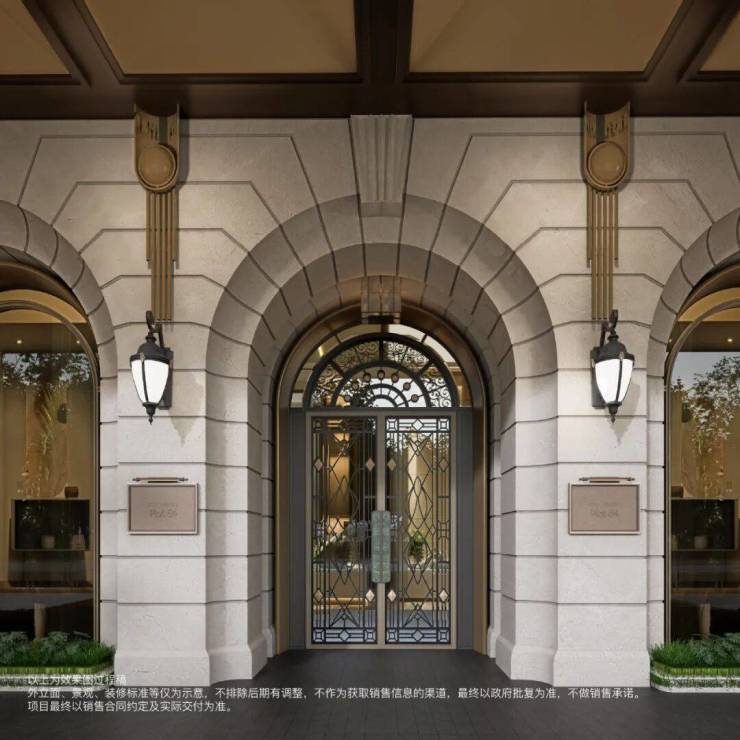 高层与洋房承袭外滩经典建筑的“横纵三段式” 结构,由下至上的力量感,树立起极具辨识度的优雅姿态。别墅则甄取华盛里石库门的过街楼、老虎窗、立面腰线等元素,以大面积石材与金属细节点缀,实现历史符号的当代奢华表达。