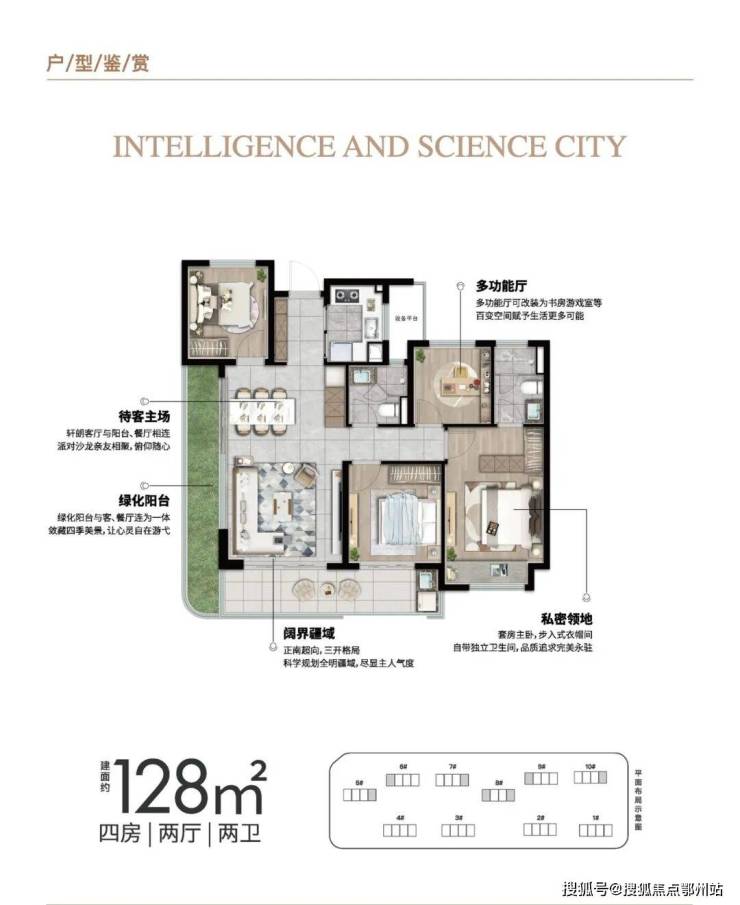 建面约128m²户型,更是将尺度升级,以四室满足三代同堂或二孩家庭居住需求,餐客一体连接大尺度绿化阳台,在宴客会友的同时,更能兼得窗外风景,而生活阳台则成为全家人的志趣领域,莳花弄草、摆弄茶具、品读书籍皆不在话下;更设计有多功能空间,可灵动应需而变,予生活更多可能。