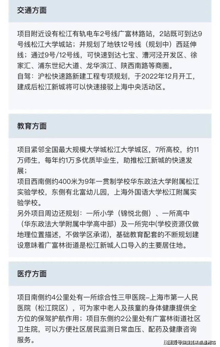 另外项目周边还规划:一所小学(锦悦北侧)、一所高中(华东政法大学附属中学高中部)及一所完中(学校资源仅做地理位置描述,不做学区承诺),基础教育配套的不断规划建设意味着广富林街道是松江新城人口导入的主要居住地。