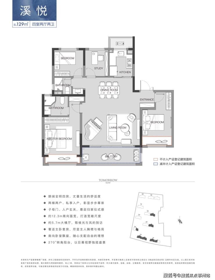 建筑面积约148㎡ 四室两厅两卫,两梯两户设计,重塑归家仪式,阔绰子母门,入户双玄关,约7.3m横厅开间,主卧套房,独立卫浴尊享私属,南北双阳台,延伸景观视野