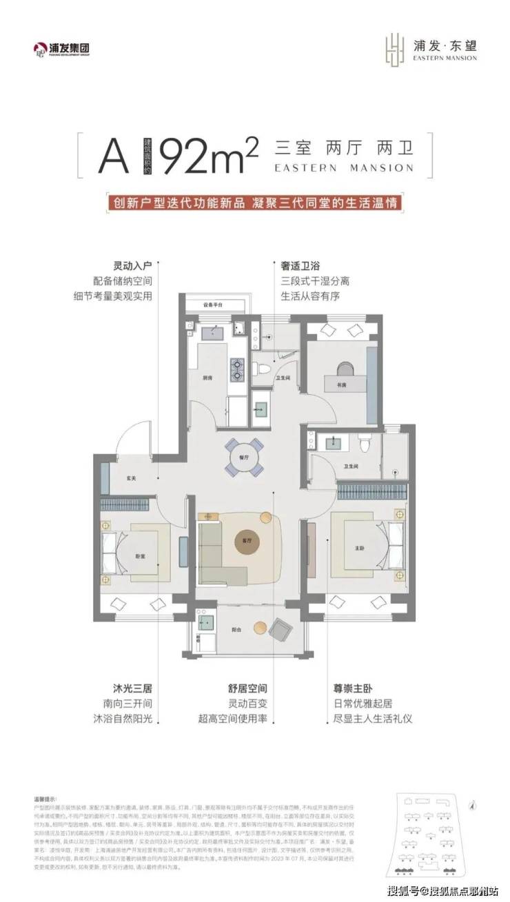 有别于市面上的同类其他楼盘,浦发东望在所有户型设计上至少为三开间朝南,这对于任何家庭结构的购房者来说,都能享受到更好的采光、通风、视野。此外,一梯两户和两梯两户的布局,北侧均无连廊。居住舒适度大大提升。