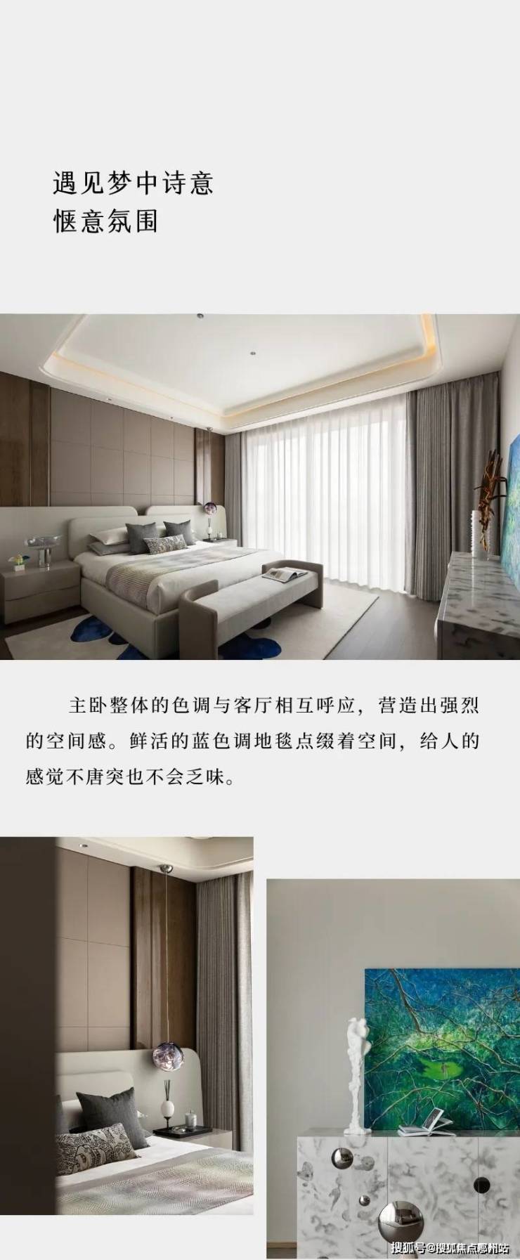 再来看色调。320方样板间整体以米白、金色为主色系,但在装饰和摆件的选择上,又以蓝色和绿色点缀其中。这样的选择反而从千篇一律的设计风格中跳脱出来,成为点睛之笔。