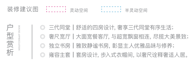 该户型 奢适四房设计 ,拥南向阳光双卧、北向次卧和书房, 一家三代同室而居,也能从容生活,尽享天伦之乐 。