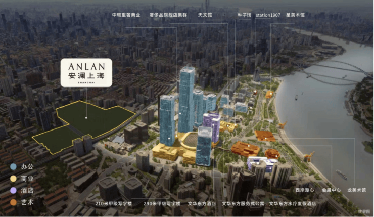 另一方面以安澜上海大盘形态为枢纽,串联徐汇滨江向心辐射,并带动徐汇区中下游板块和产业发展的全新局面。两大地王项目合力擘画约260万方,汇聚顶级产业、商业、总部办公、文化艺术、滨江生态、高端居住、高奢酒店七大顶级要素的滨江封面。