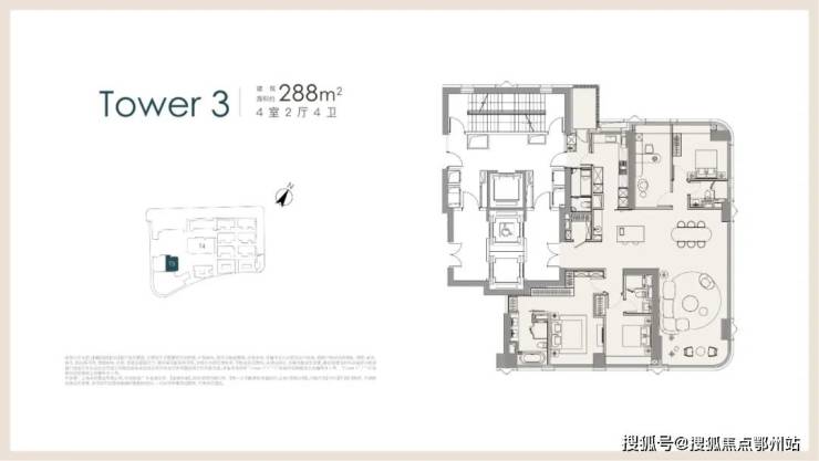项目分为前后南北双地块,各有2栋150米超高层和风貌别墅,超高层44层、层高3.3米,大户型层高约3.5-3.6米。